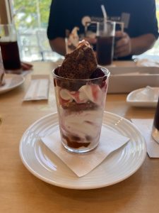 横山さんに聞いたところ、さんかくパフェに入っているメレンゲクッキーは、カフェに隣接しているB型作業所「アトリエ・モモ」の利用者さんが作ったもので、割れてしまったりして商品にはできないものをパフェの材料として提供しているとのことで、フードロスの取り組みとしても素晴らしいマッチングになりました。